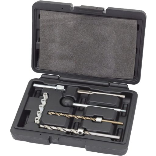 A befecskendező menetjavító készlet tartalmazza a törött csavar kifúrásához és az M6 menetes betétek felszereléséhez szükséges speciális szerszámokat,