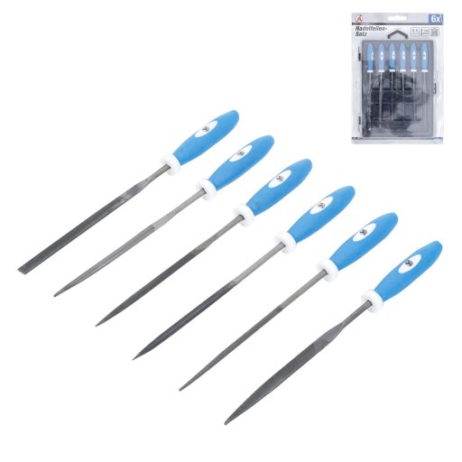 6 db-os készlet különböző kialakítású tűreszelők: lapos, kerek, négyzet, háromszög, félkör, lapos, kúpos