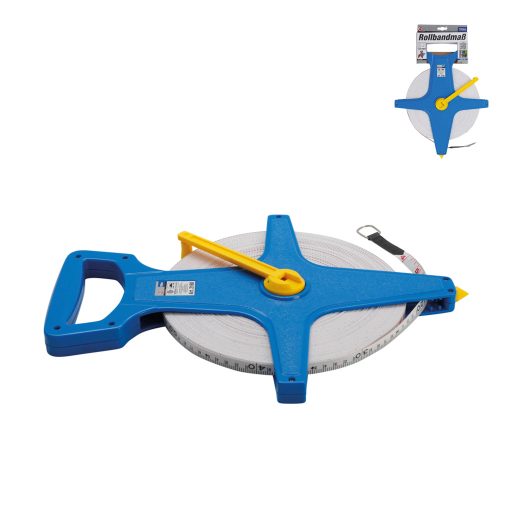 Mérőszalag 100 méteres szalaggal műanyag keresztkerettel és behúzható tekerő-fogantyúval ellátva.