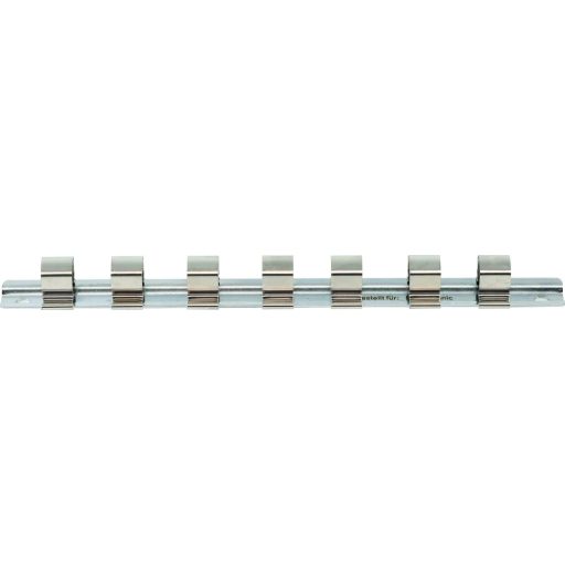 Krómozott kivitelű fém sín 7 db 1/2"-os dugófej tárolásához.