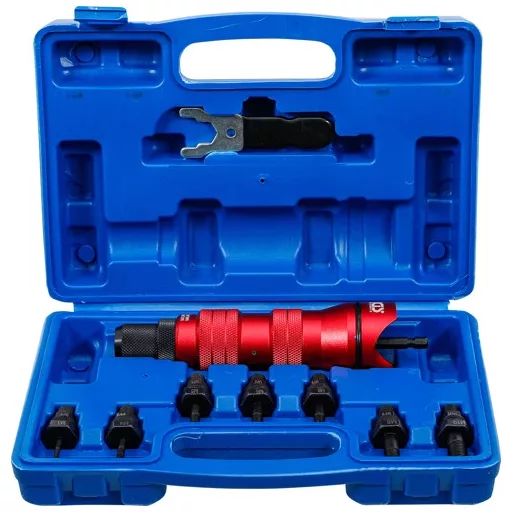Szegecsanya behúzó készlet amely acél, alumínium és rozsdamentes acél szegecsanyákoz is használható.