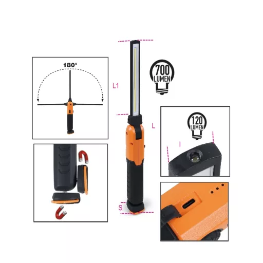 tölthető LED szerelőlámpa, kettős fénykibocsátással, csuklós, 180°-ban elforgatható, mágneses forgótalppal és kampóval