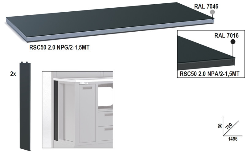 BETARSC50 2.0 NPA/2-1,5MT|RSC50 2.0 NPA/2-1,5MT Fémlemez munkalap, 1,5 m széles, munkapadhoz, az RSC50 2.0 műhelyberendezés összeállításhoz