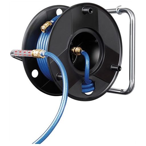 Kivitel: Különösen robusztus modell nagyszilárdságú speciális műanyagból, minőségi szövetbetétes tömlővel. Horganyzott acélcső váz. A tengelyirányú csatlakozónak köszönhetően a tömlő üzem közben is fel-, ill. lecsévélhető a dobra, ill. a dobról. Szállítás egykezes fém gyorscsatlakozókkal, összekötő tömlővel és fali tartóval.