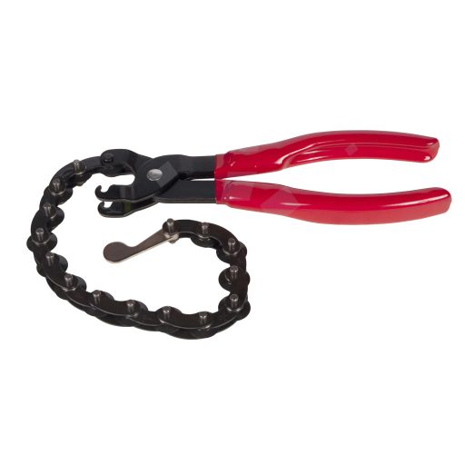Kipufogó csövek vágására kialakított vágó-görgős lánccal szerelt speciális fogó.