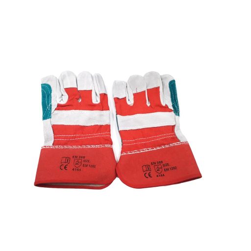 Munkáskesztyű, hasított tehénbőrből és piros pamut szövetből.