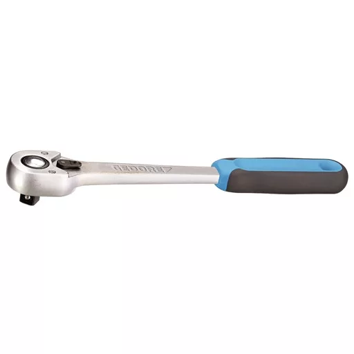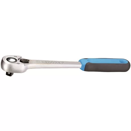 • Különösen robusztus alkalmazáshoz az iparban és a haszongépjármű területen • DIN 3122, ISO 3315 szerinti kivitel • Mélyebbre helyezett átkapcsoló karral • Nyomógombos kioldással • Utánfogási szög 7,5 fok • Csúszásgátló 2 komponensű markolat felakasztó lyukkal • Racsni reteszelés középállásban. Átkapcsoláskor a kapcsolókar automatikusan rögzül jobbos és balos meghúzáshoz • Kézi hajtású dugókulcs betétekhez és közdarabokhoz DIN 3120 - C 12,5, ISO 1174 szerinti négyszög hajtással, golyós reteszeléssel • GEDORE 31CrV3 vanádium acél, krómozott