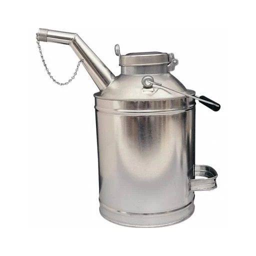 10 literes fém olajbetöltő kanna. Kiöntő fogantyúval a nagyobb biztonságért. Hosszú kiöntőnyílás láncos zárókupakkal és forgópántos zárófedéllel.