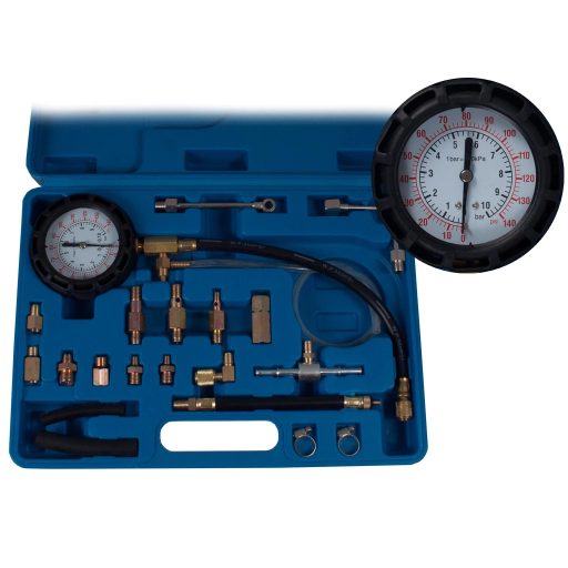Átfogó adapter és szerelvény készlet az üzemanyag-szivattyú nyomásának ellenőrzéséhez a befecskendező-rendszerű járműveknél.