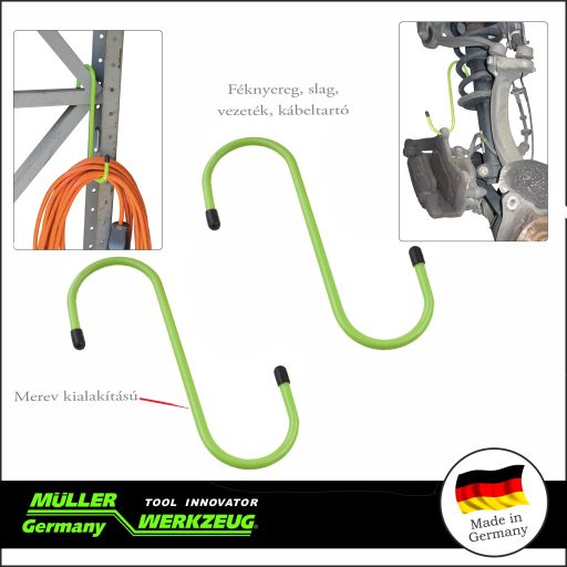 - Speciálisan kialakított, alumínium alapanyagú, hajlítható gumis bevonatú kampó, mely féknyergek, slagok, csöveg, vezetékek tárolására gyártották