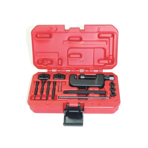 Lánc szétszedő és összeszegecselő célszerszám készlet, elsősorban motorkerékpárokhoz.