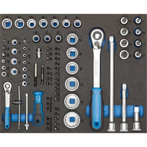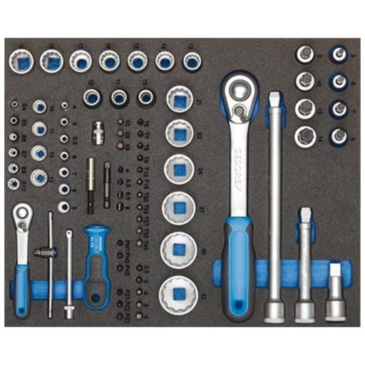 Kivitel: GEDORE műhelykocsikhoz és gurítható munkapadokhoz. Szállítás kétszínű habszivacs betétben, így a hiányzó szerszámok azonnal felismerhetők.