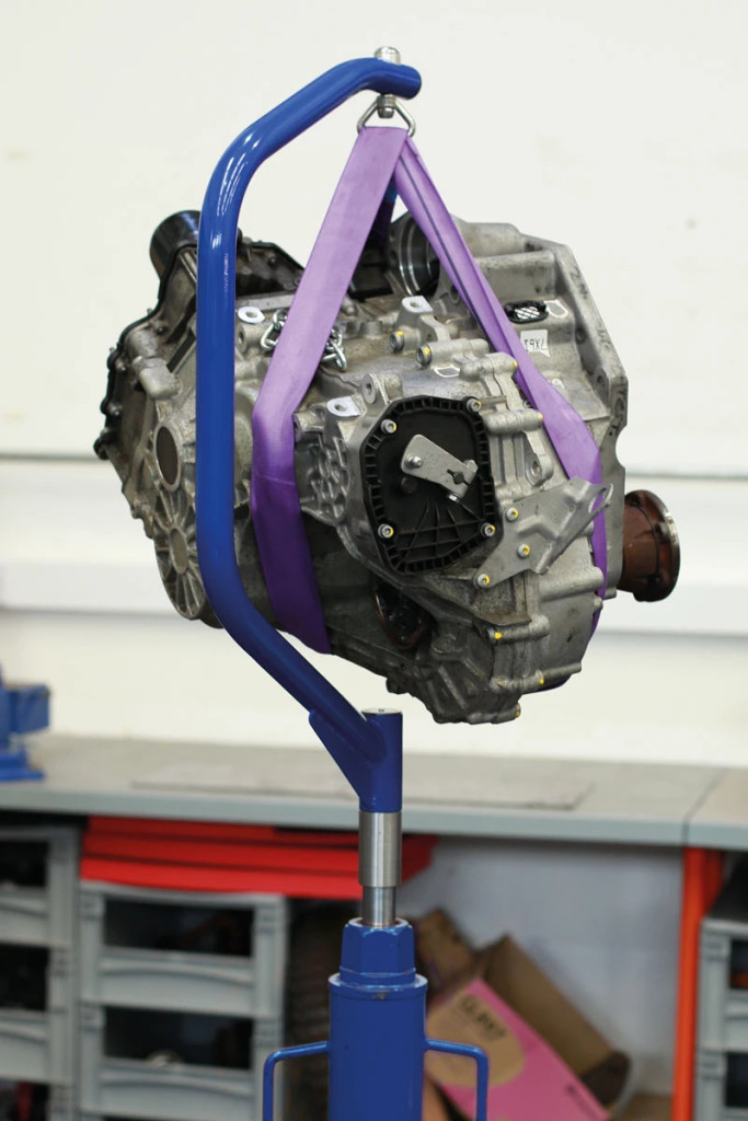Hagyományos sebességváltó-emelővel kombinálva ez a szabadalmaztatott eszköz leegyszerűsíti a sebességváltó ki- és beszerelését azáltal, hogy felülről támasztja meg a sebességváltót.