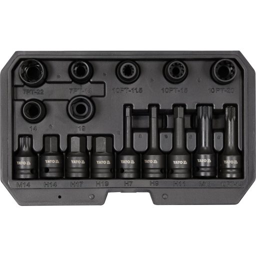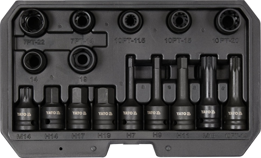 - speciális 1/2"-os 5-lapú dugókulcsok: 14 mm, 19 mm, 1/2"-os 7-pontos dugókulcsok: 14 mm, 22 mm, 10-pontos: 11,5 mm, 15 mm, 20 mm